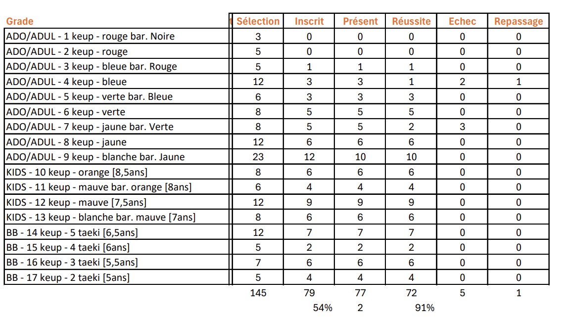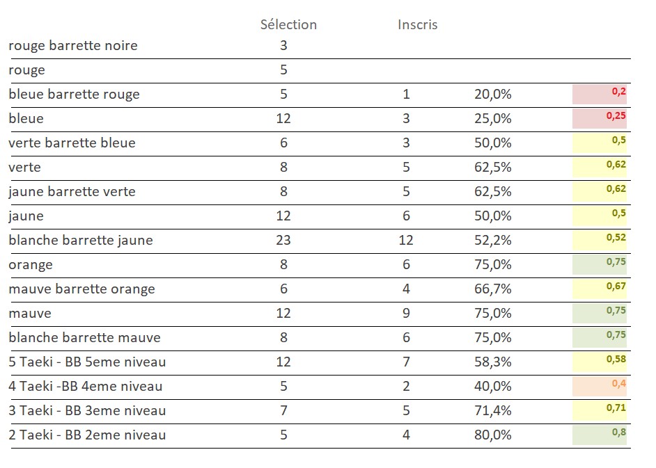 - Le volume d’entrainement pour chaque grade.